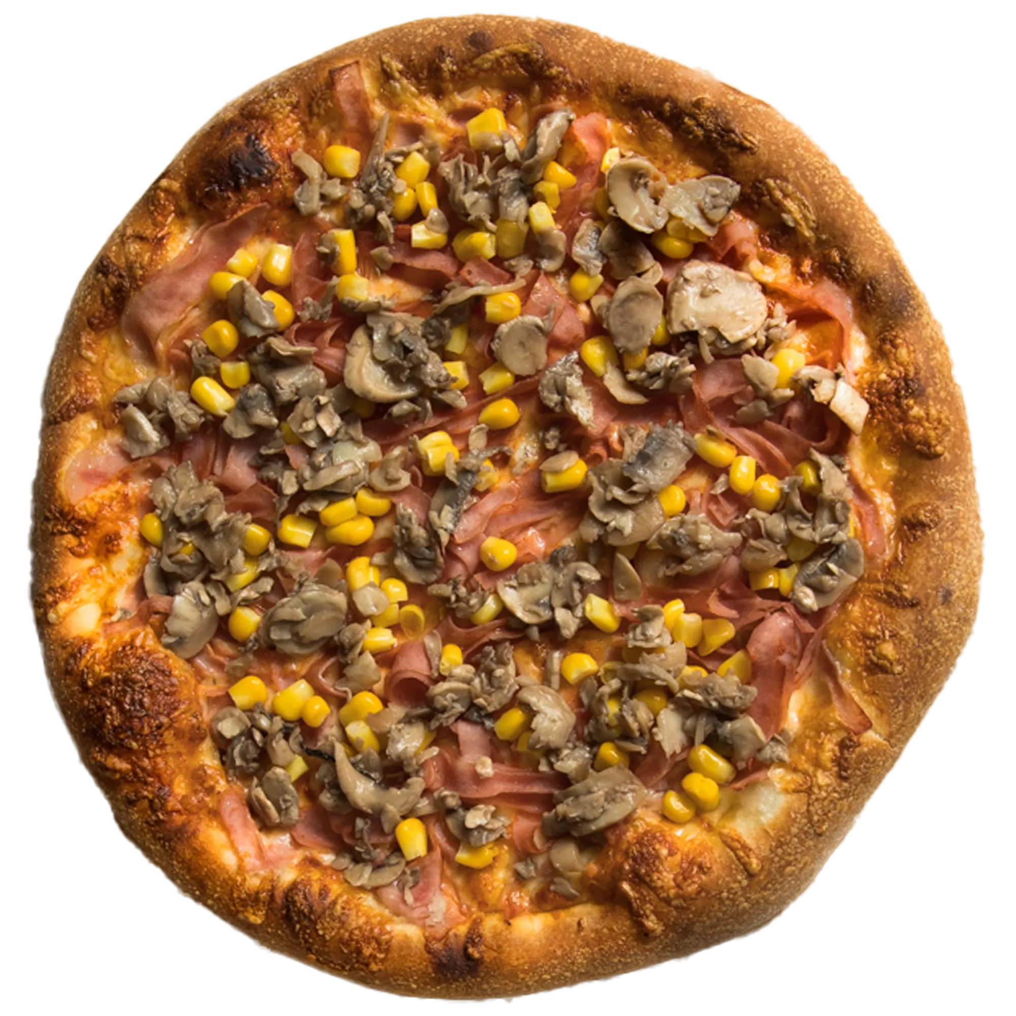 pizzaszósz, sajt, sonka, gomba, kukorica