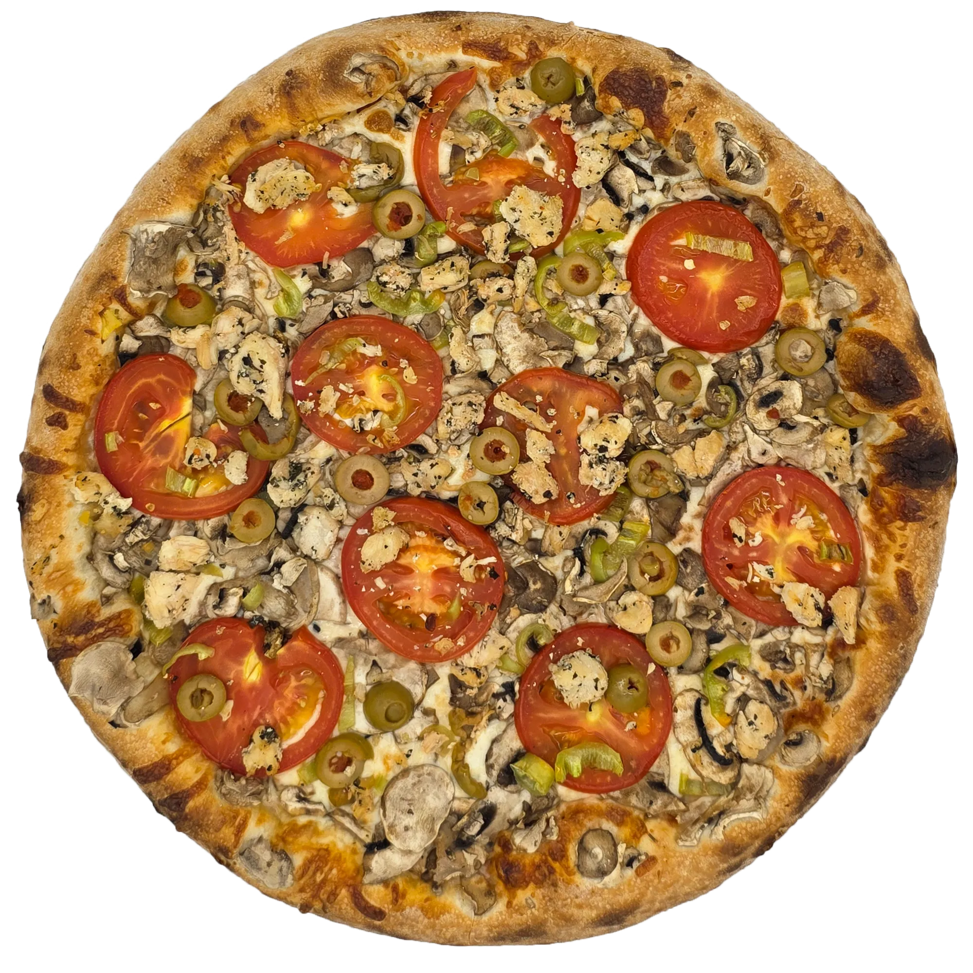pizzaszósz, sajt, csirkemell, gomba, zöldpaprika, oliva, paradicsom