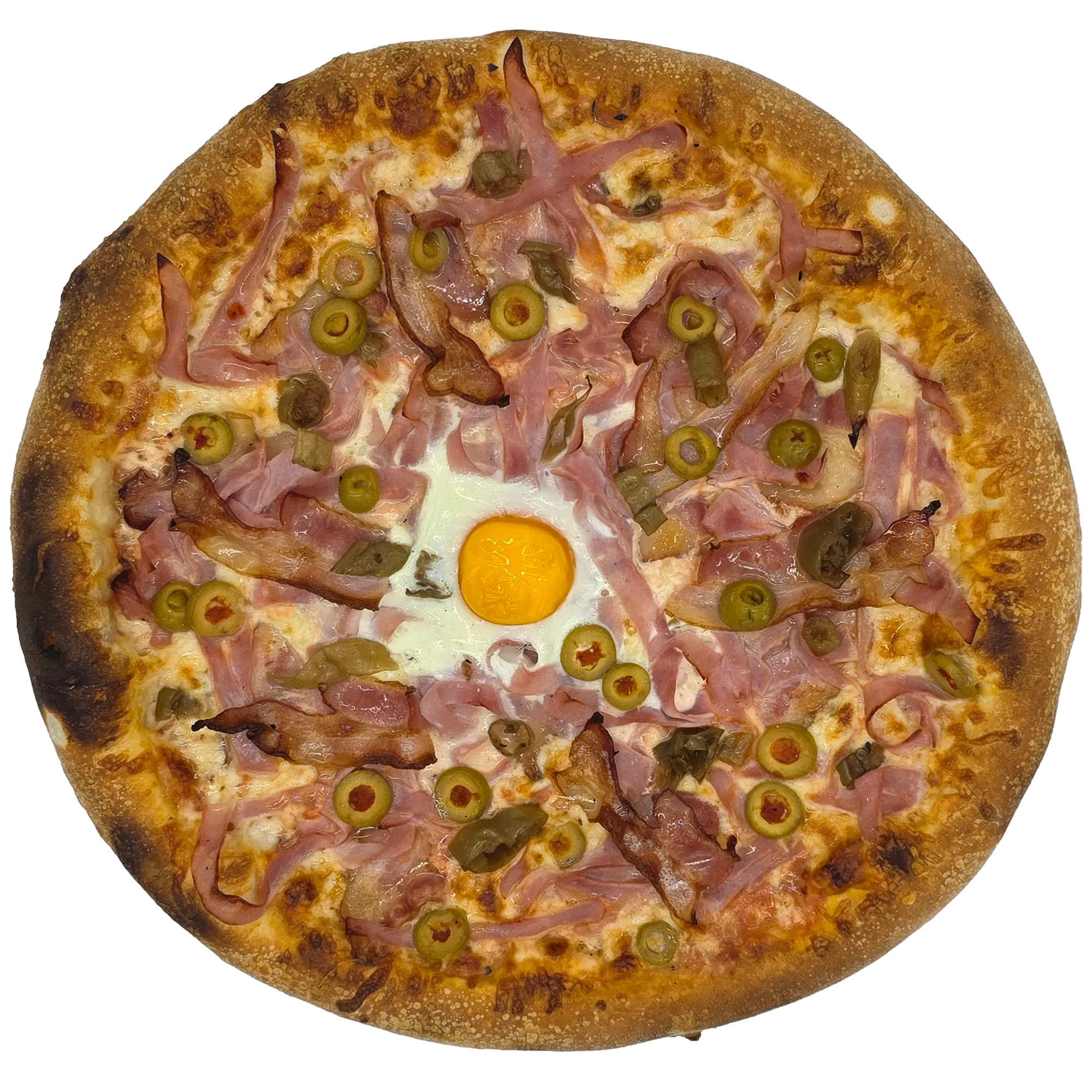 pizzaszósz, sajt, sonka, bacon, olivabogyó, pepperoni, tükörtojás