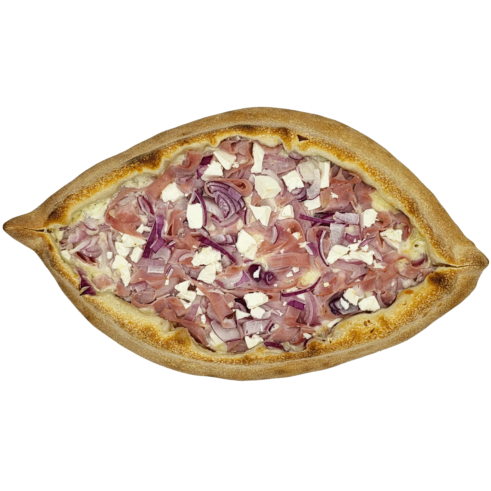 tejfölös alap, sajt, sonka, lilahagyma, feta sajt