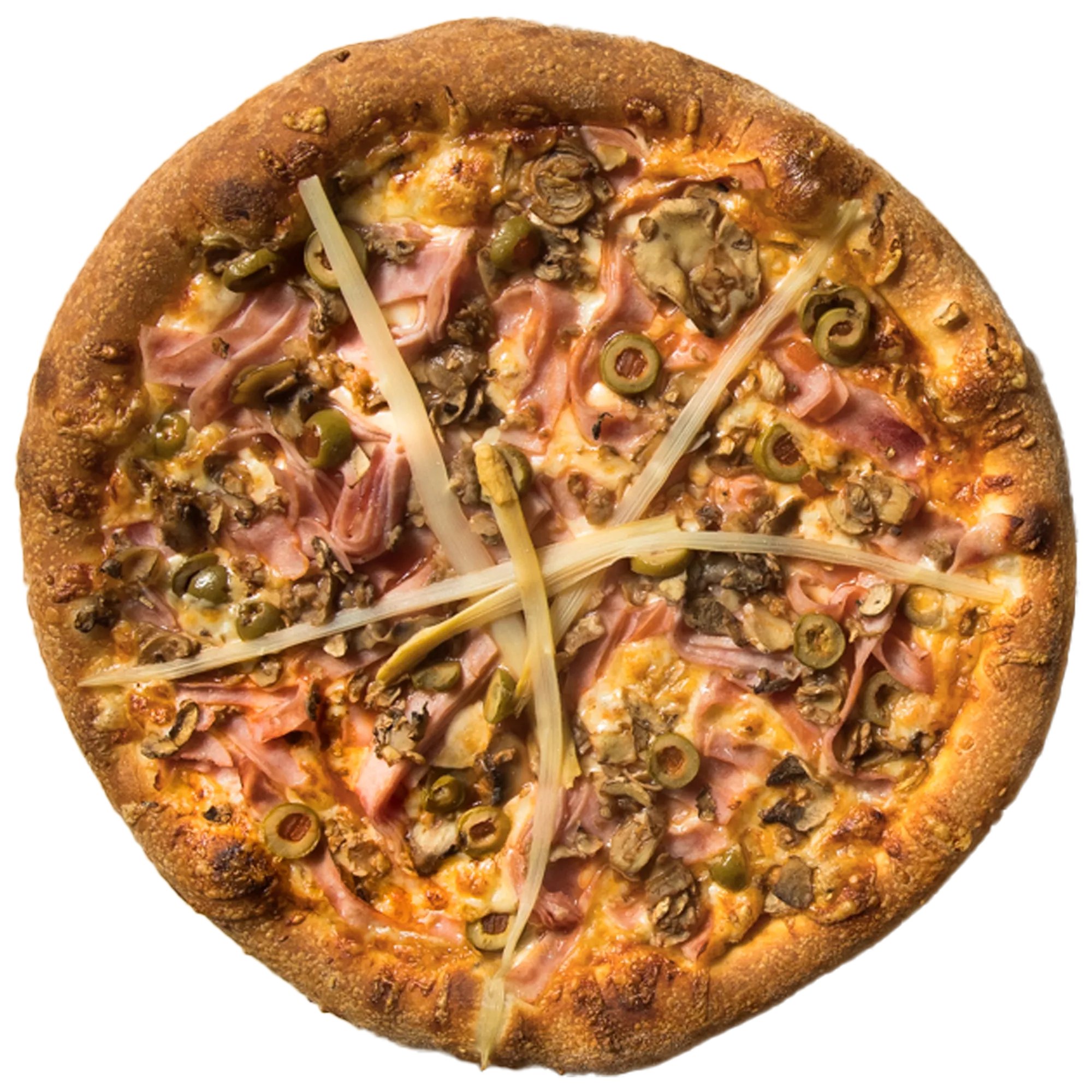 pizzaszósz, sajt, sonka, gomba, spárga, oliva