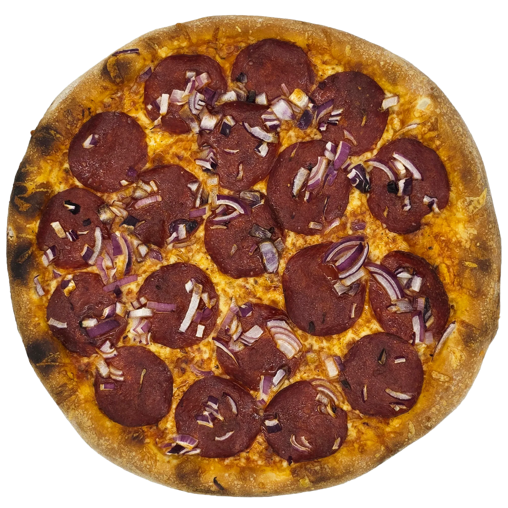 pizzaszósz, sajt, szalámi, hagyma